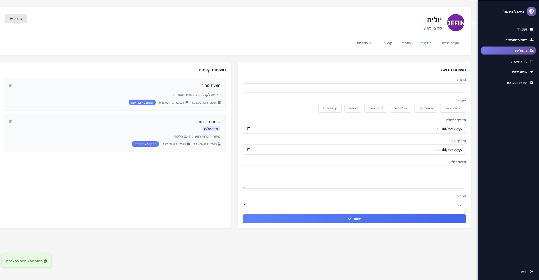 "מערכת הלידים החדשה פשוט מדהימה! היא כל כך קלה לתפעול, ועזרה לצוות שלנו להיות הרבה יותר ממוקד ואפקטיבי. סוף סוף יש לנו שליטה מלאה על כל ליד וליד."